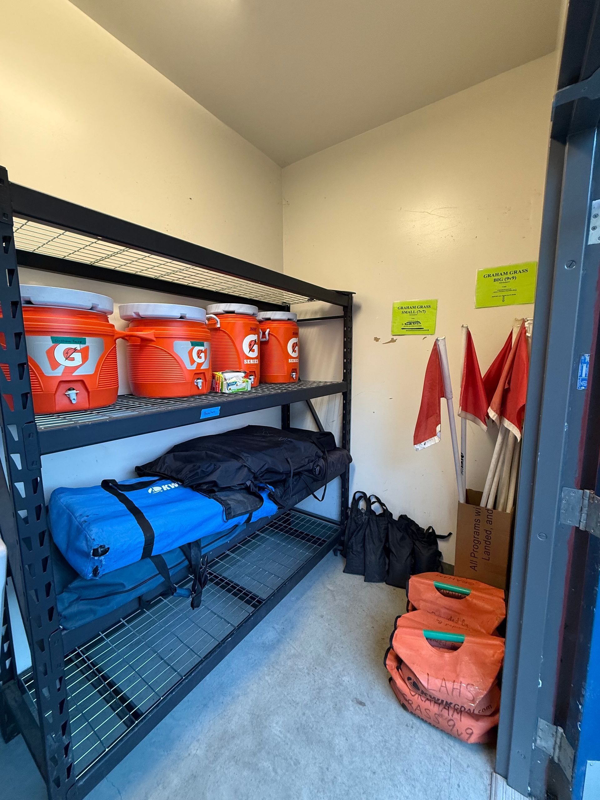 Equipment is stored in Unit B on the opposite side of the concession / bathroom building. The key is located in a key lock box located on the fence next to the building. Note that there are 2 lock boxes. MVLA’s lock box is the large Igloohome lock box on the left side of the fence. Type in the code and press the unlock button, wait for the light to flash green, then pull the front of the box open. Return the key IMMEDIATELY to the key lock box after opening the door and propping it open before retrieving ANY equipment. DO NOT place it in your pocket and forget to return it.
